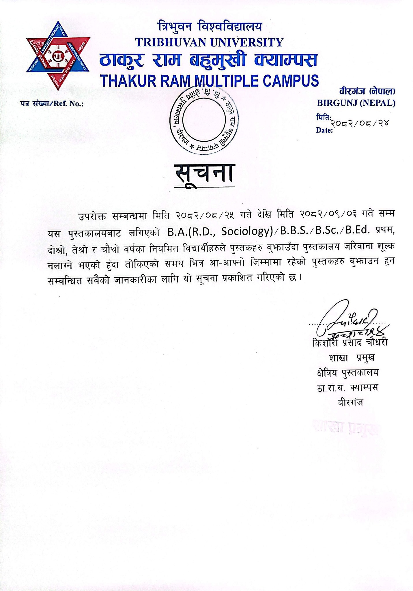 स्नातक तह (BBS, B.Ed.B.Sc. र BA ) प्रथम बर्षको Library Card बनाउने सम्बन्धी सूचना ।