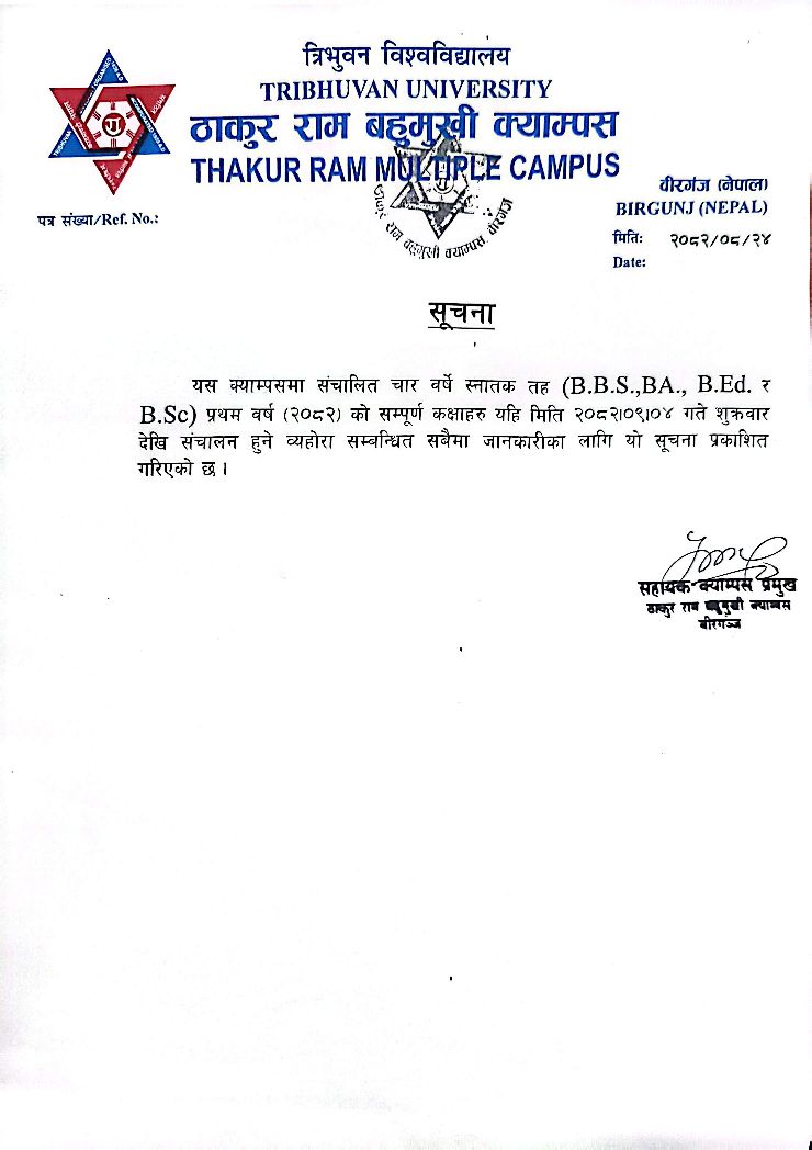स्नातक तह (B.B.S., B.Ed.,B.Sc. र B.A.) प्रथम वर्ष–२०८२ समूहको कक्षा संचालन सम्बन्धी सूचना