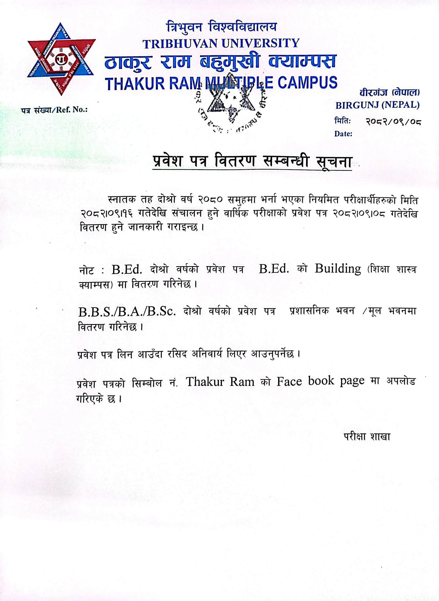 प्रवेश-पत्र वितरण सम्बन्धी सूचना (Bachelor 2nd year-2080 batch)