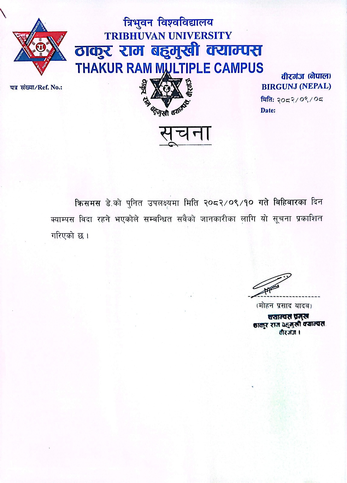 क्रिसमसको बिदा सम्बन्धी सूचना