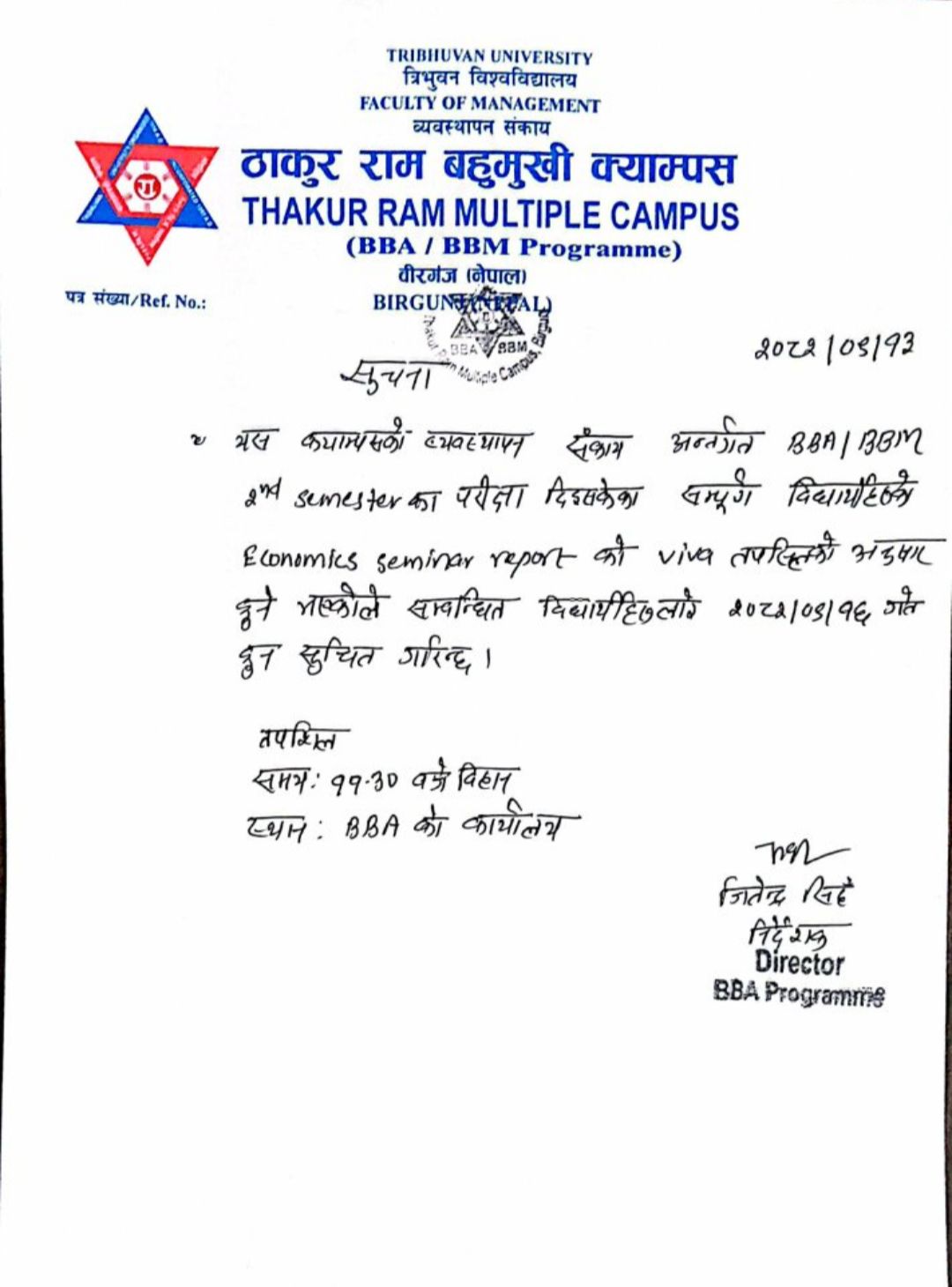 Notice Regarding Viva of BBA/BBM 2nd Semester (Economics Seminar Report)