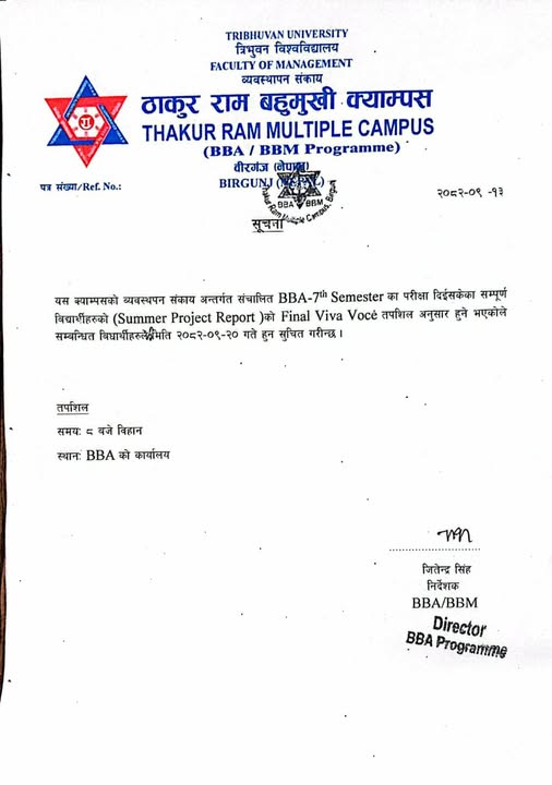 Notice Regarding Final Viva Voce of BBA 7th Semester Summer Project Report