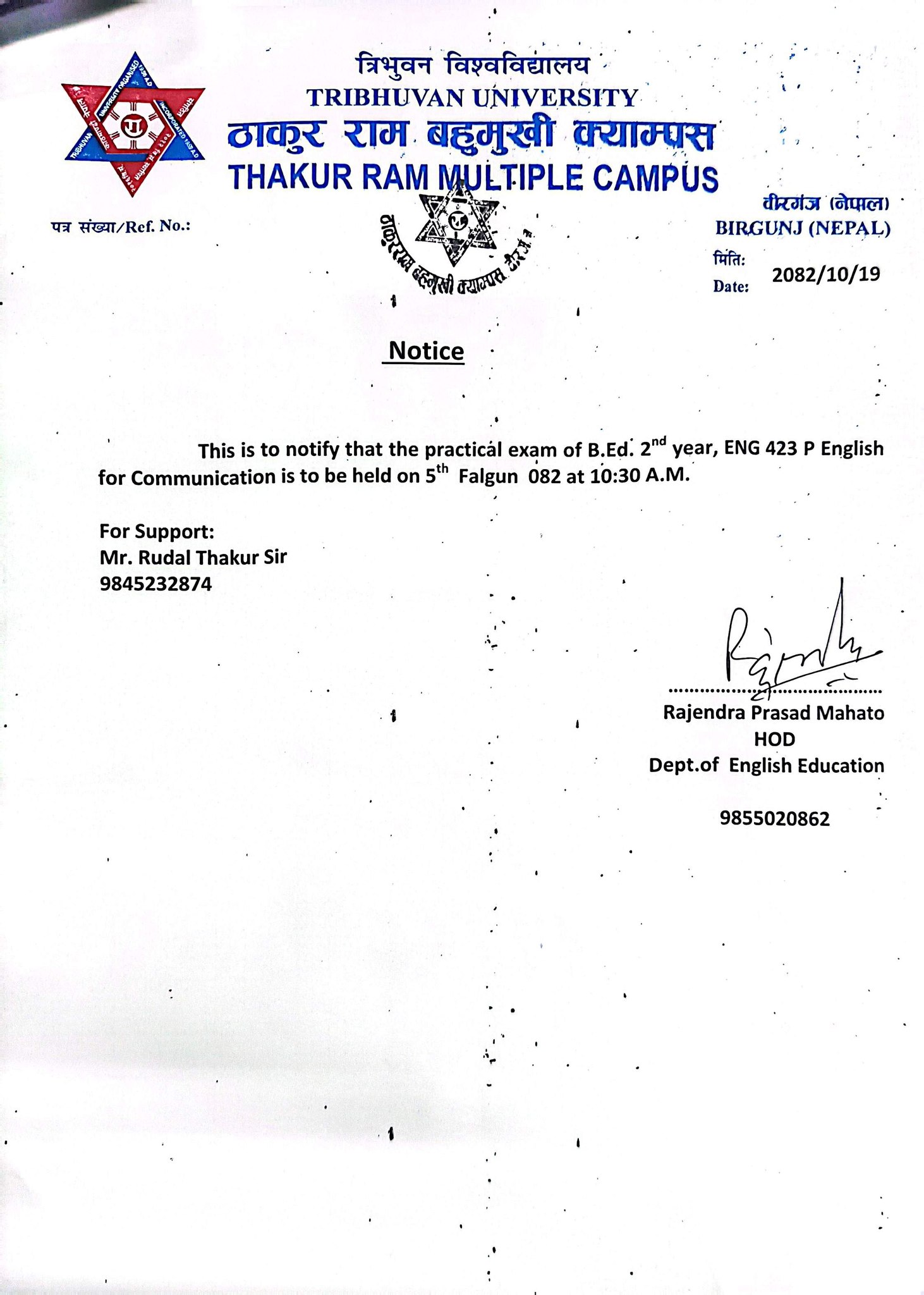 Notice Regarding Practical Exam of B.Ed. 2nd Year (ENG 423 : English for communication)