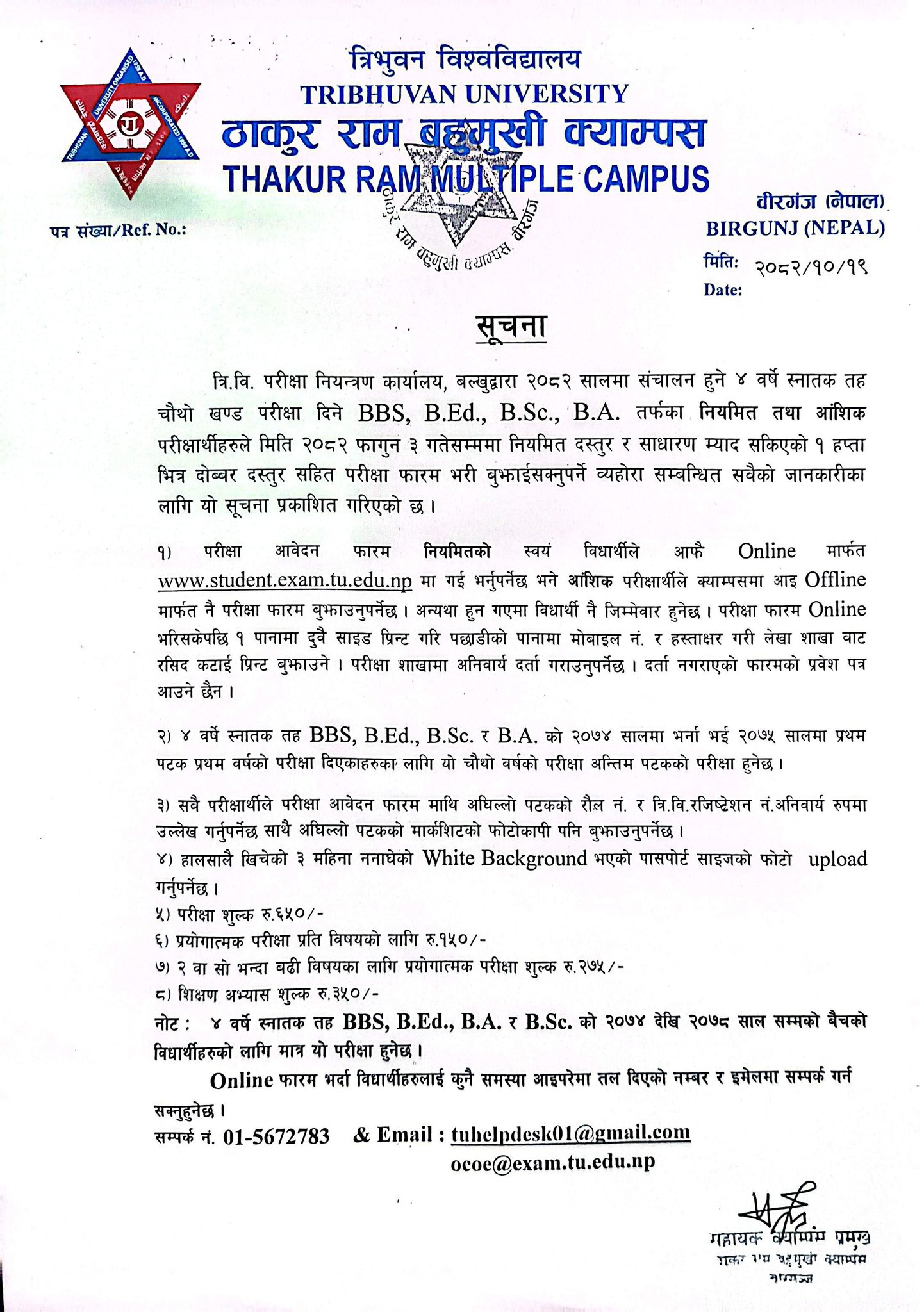स्नातक तह ( B.B.S., B.Ed., B.Sc. र B.A.) चौथो बर्षको परिक्षा फारम भर्ने सम्बन्धी जरुरी सूचना (Regular & Partial both)