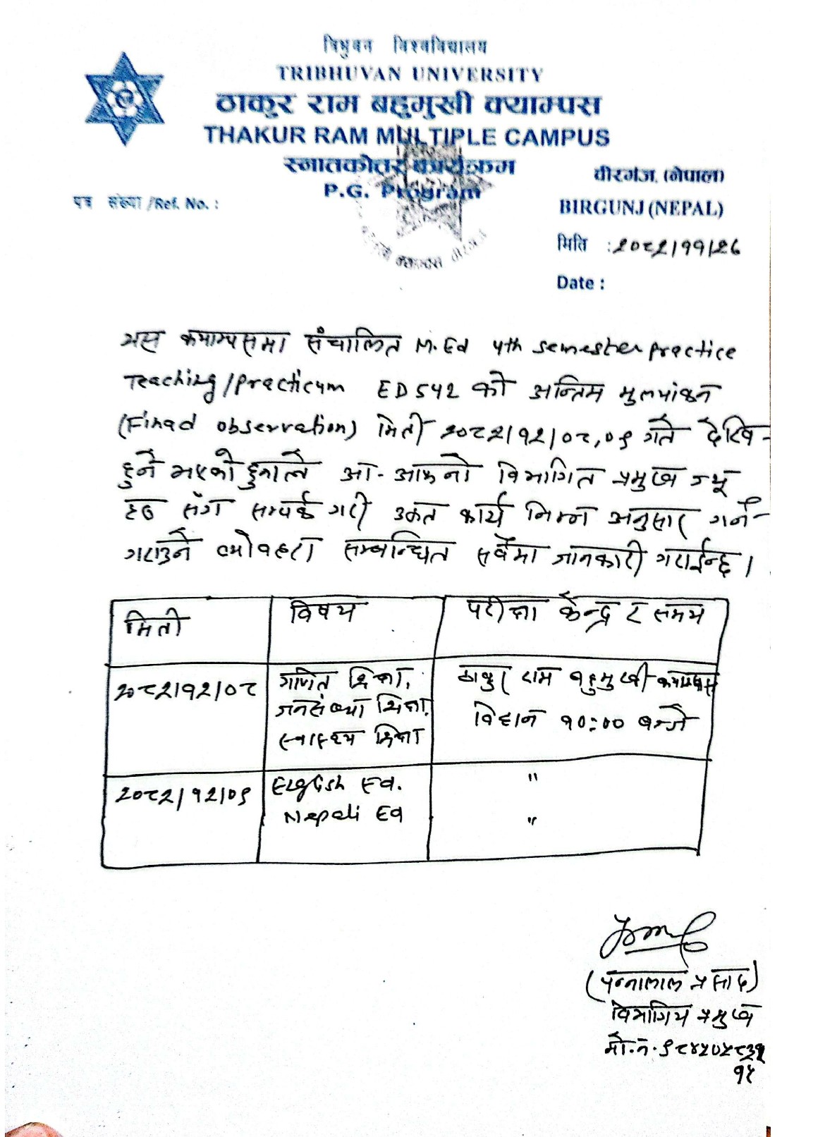 Notice Regarding Final Observation of M.Ed. 4th Semester ED 542
