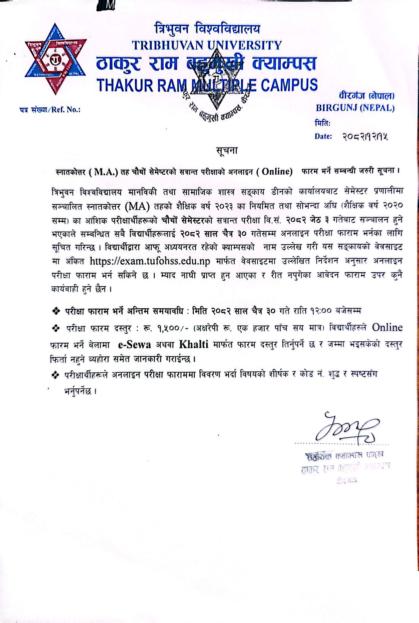 Notice Regarding Online Exam Form Fill-up of M.A. 4th Semester