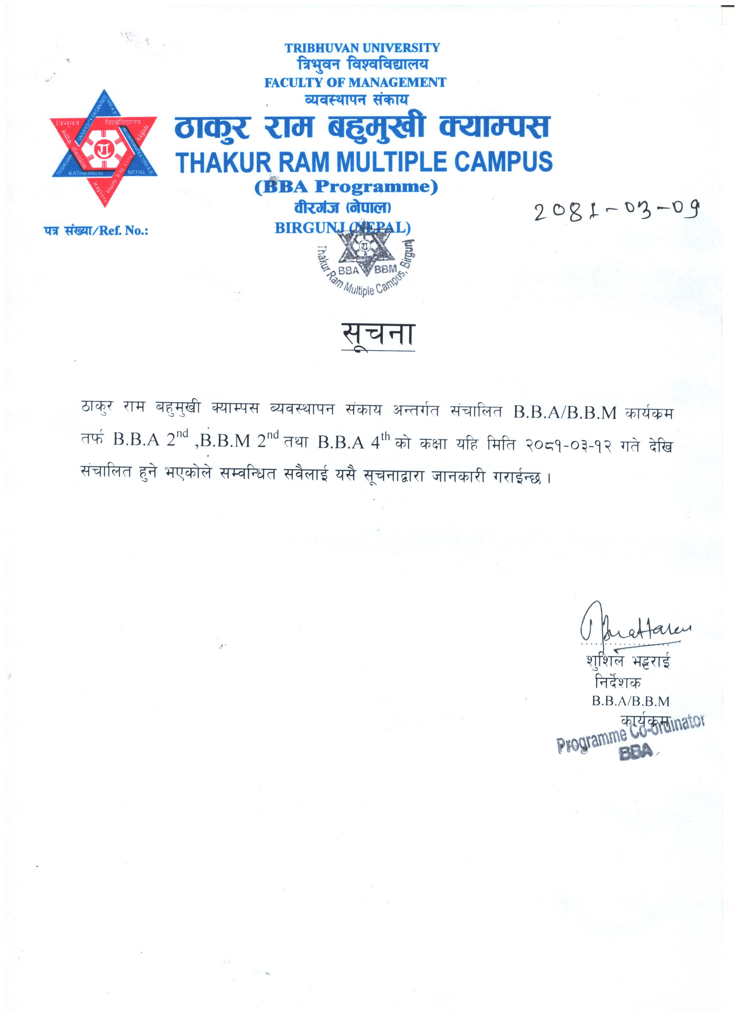स्नातक तह (B.B.S., B.Ed., B.Sc. र B.A.) तेश्रो बर्ष २०८० समुहको भर्ना तथा कक्षा संचालन सम्बन्धि जरुरी सूचना