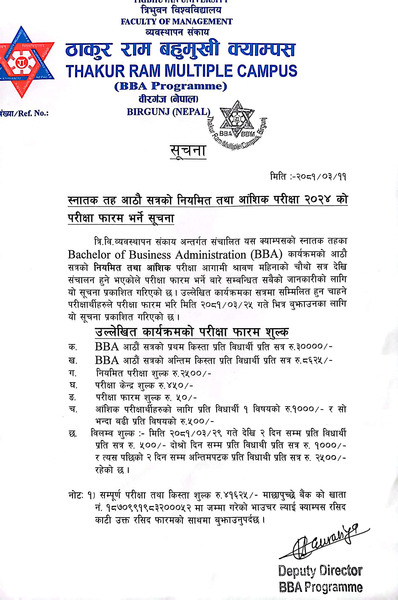Notice Regarding Exam Form Fill-up of BBA 8th Semester ( Regular & Partial both)