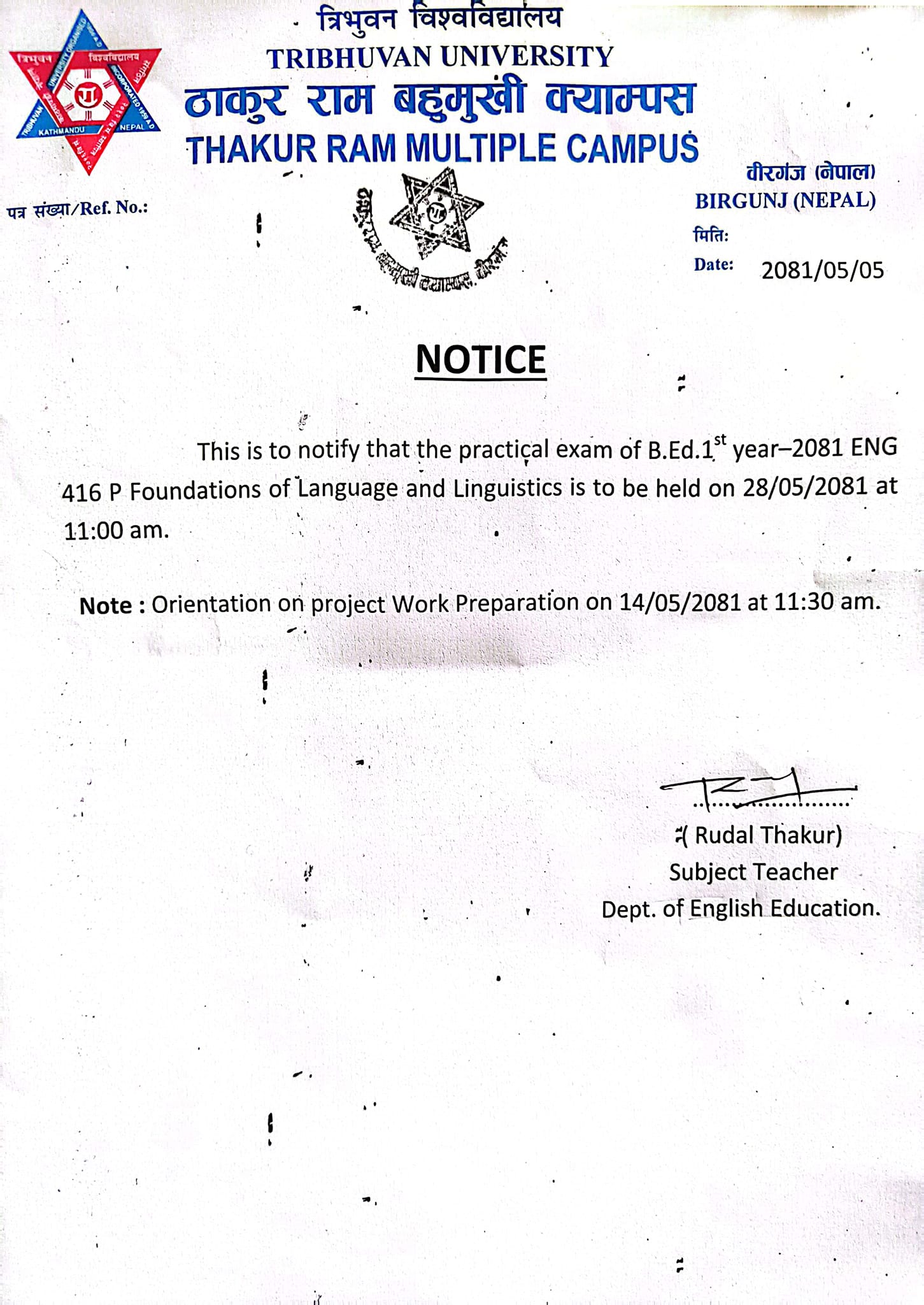 Notice Regarding Practical Exam of B.Ed. 1st Year ENG 416 P (Foundation of Language & Linguistics)