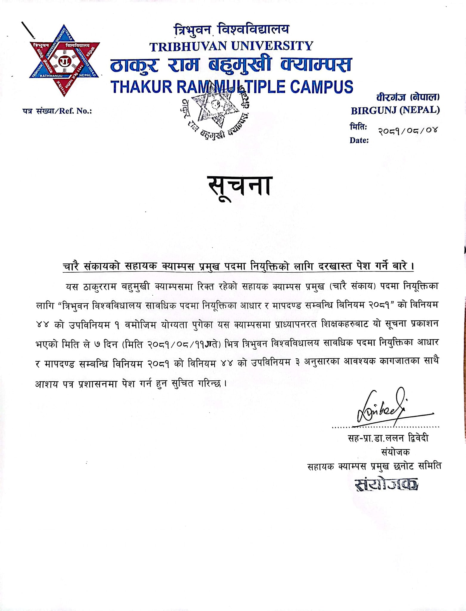 सहायक क्याम्पस प्रमुख पदमा नियुक्तिको लागि दरखास्त पेश गर्ने सम्बन्धी जरुरी सूचना।