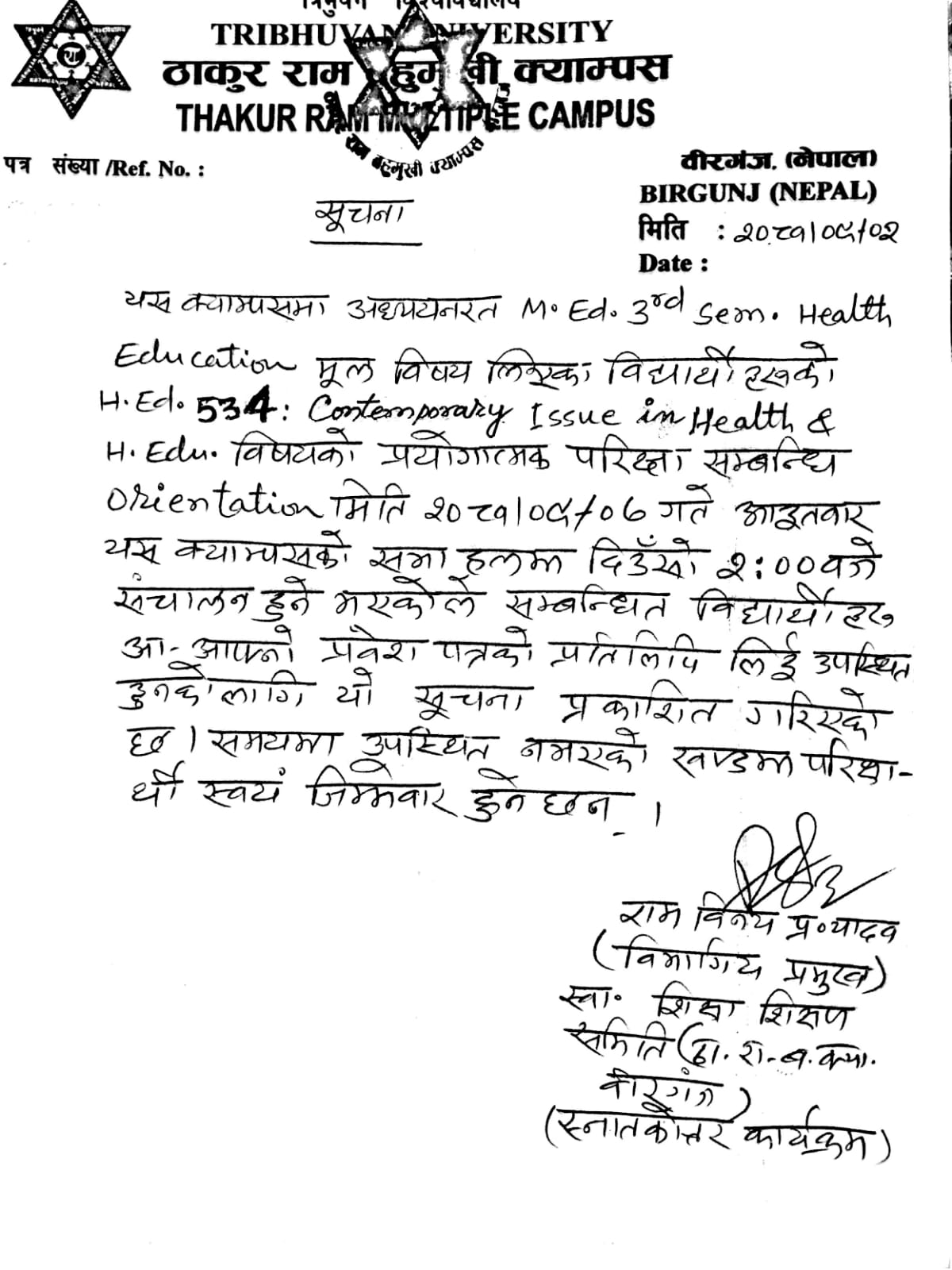 Notice Regarding Orientation Class of M.Ed. 3rd Semester H.Ed.534: Contemporary Issue in Health & H.Edu.