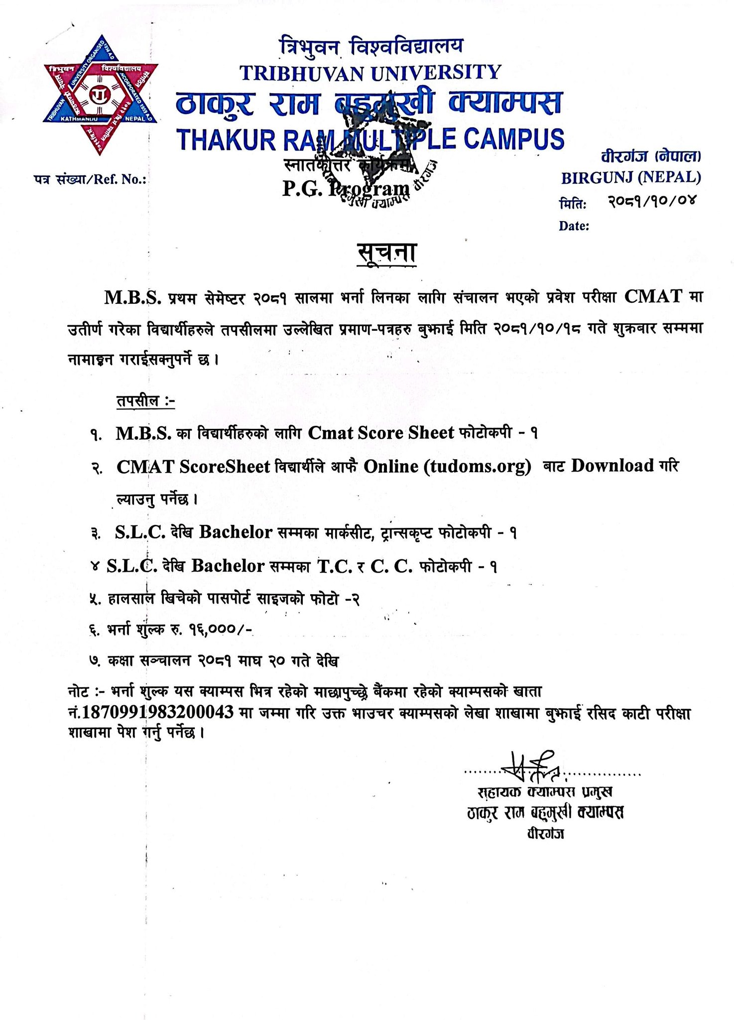 M.B.S. प्रथम सेमेस्टर -२०८१ मा भर्ना सम्बन्धी जरूरी सूचना।