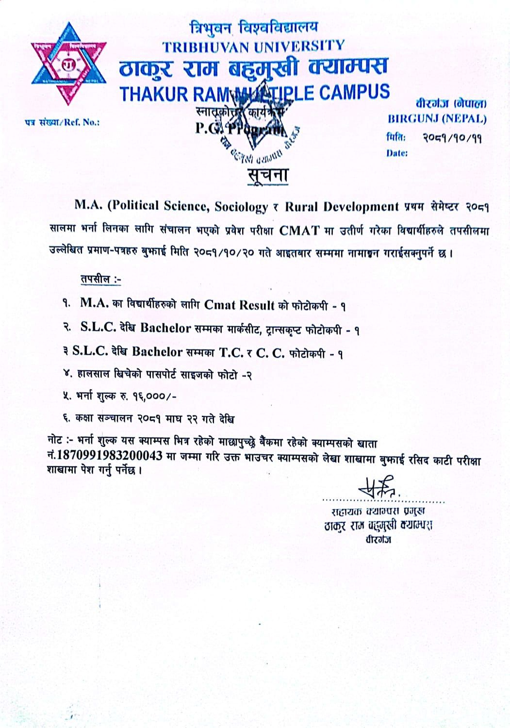 Notice Regarding Admission of M.A. (Political Science, Sociology & Rural Development) First Semester -2081