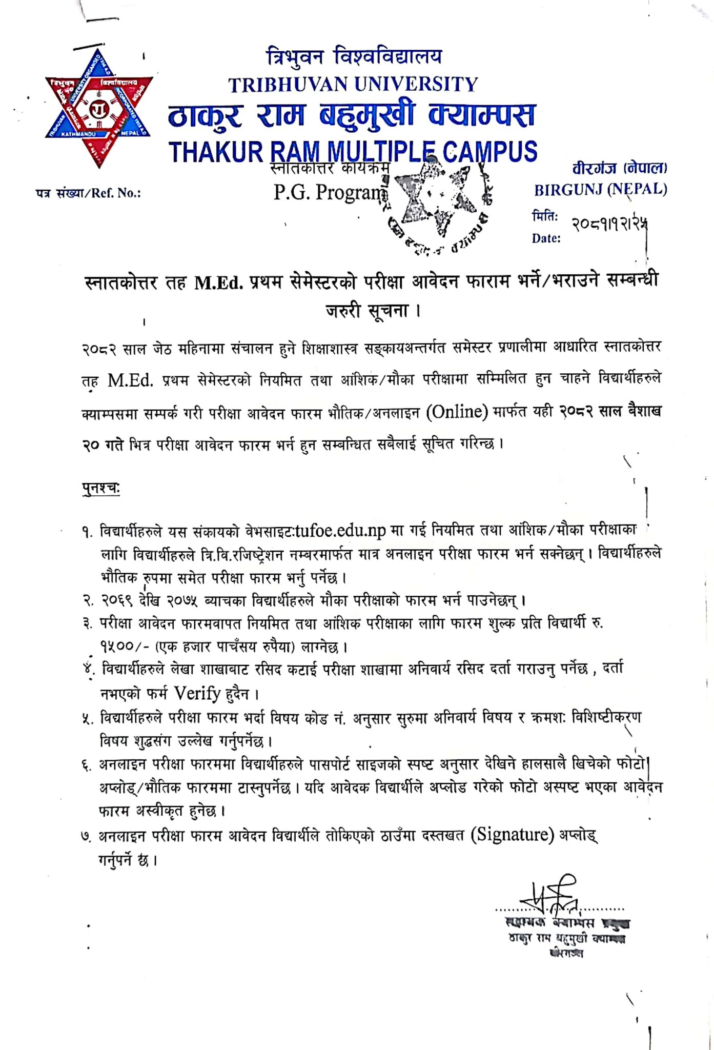 M.Ed. प्रथम सेमेस्टरको परीक्षा फाराम भर्ने सम्बन्धी जरुरी सूचना (Regular, Partial & Chance )