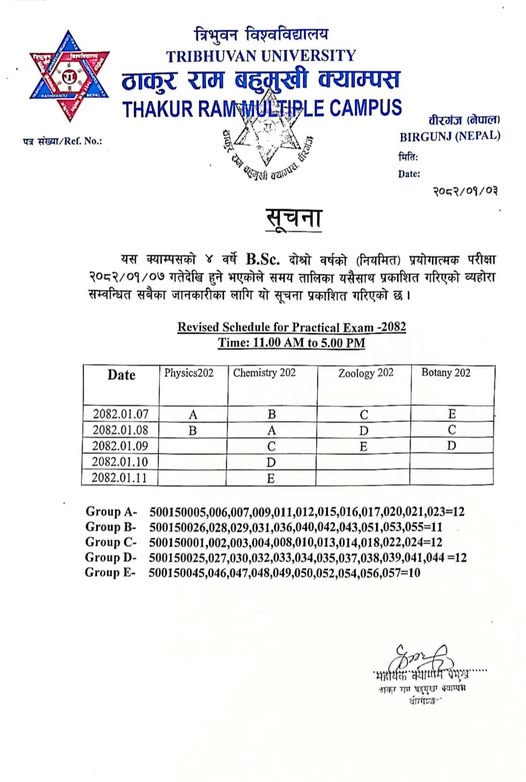 स्नातक तह (B.B.S., B.Ed., B.Sc. र B.A.) तेश्रो बर्ष २०८० समुहको भर्ना तथा कक्षा संचालन सम्बन्धि जरुरी सूचना