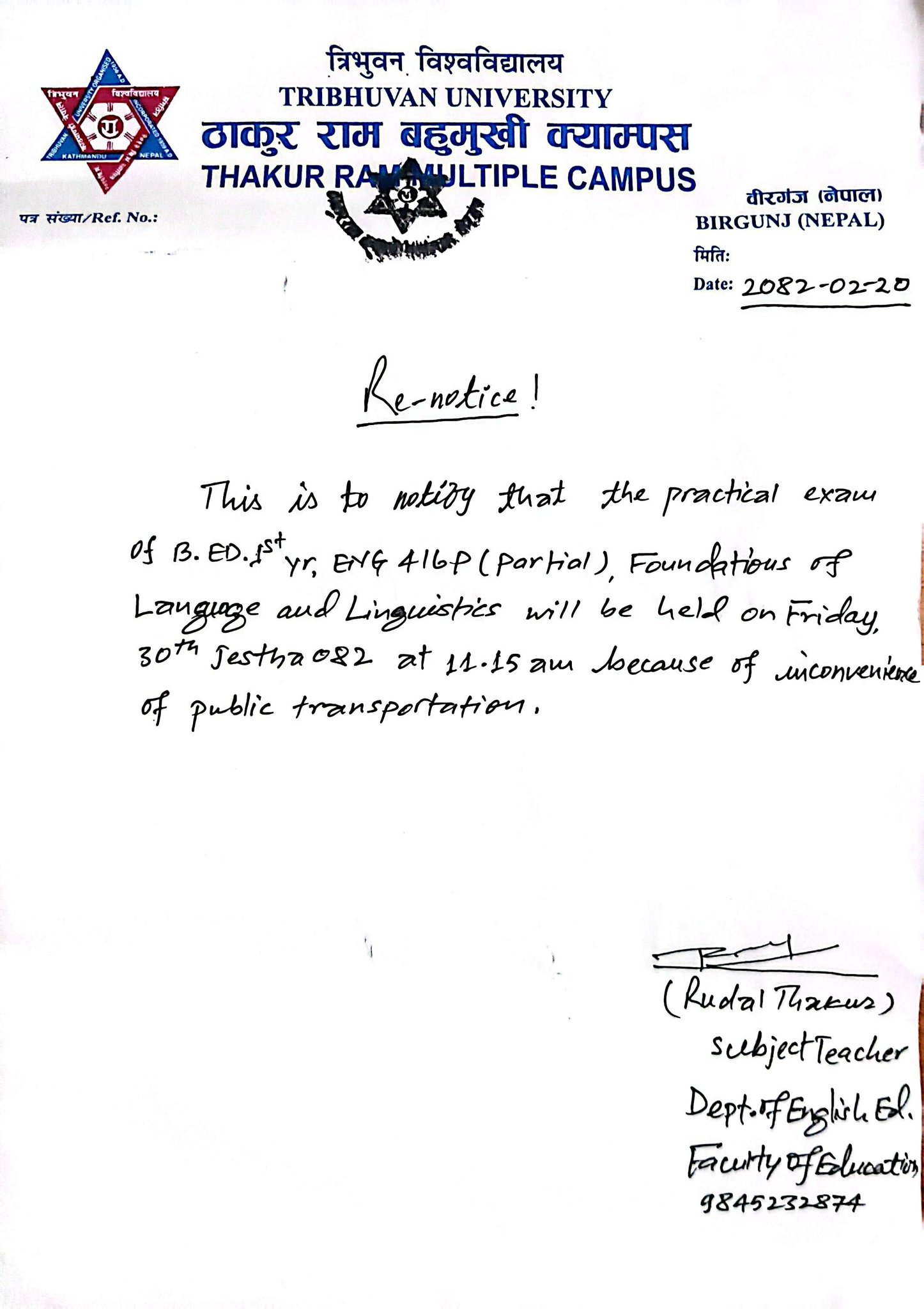 Notice Regarding Practical Exam of B.Ed. 2nd Year (2082)