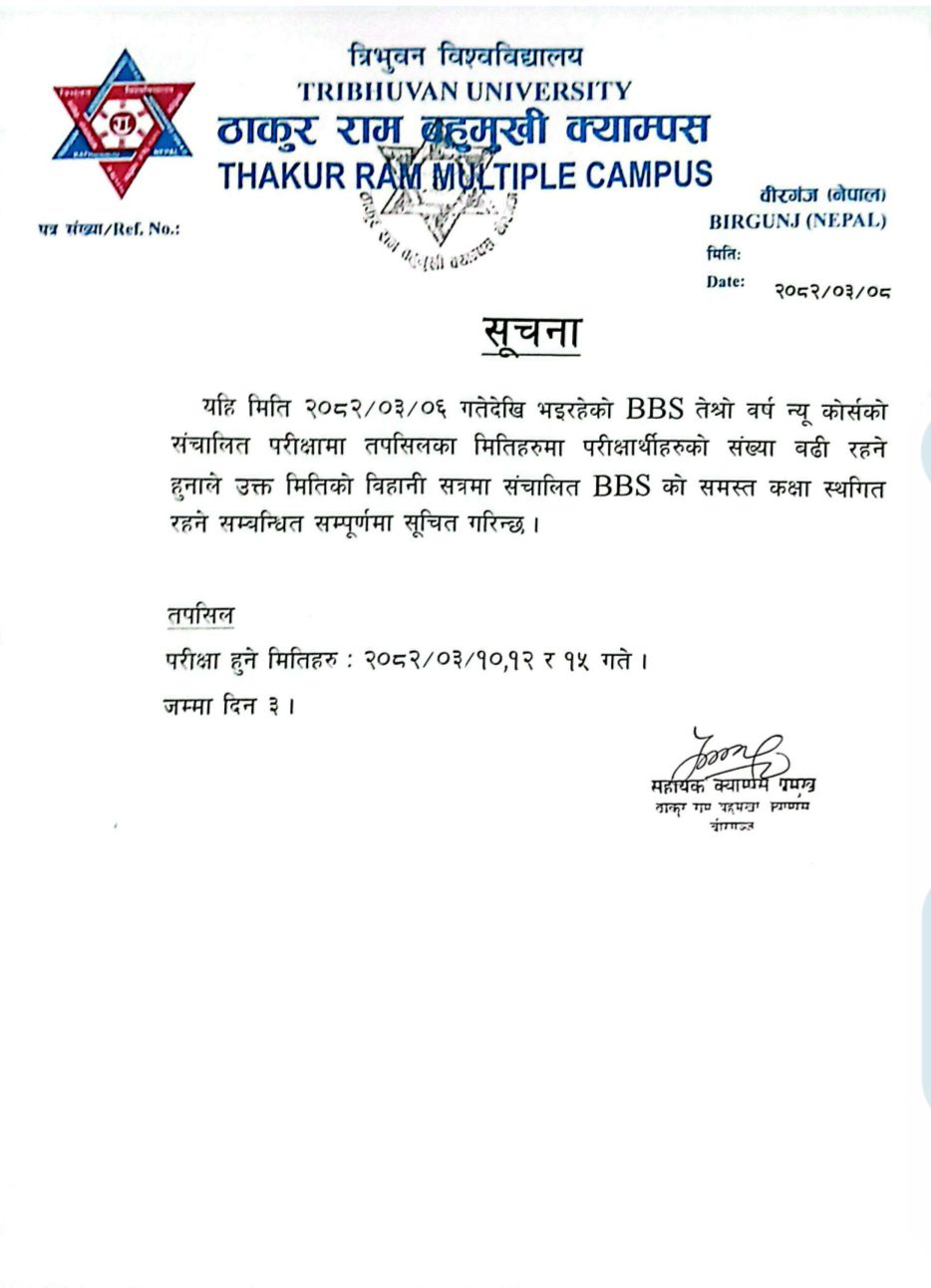 B.B.S. को कक्षाहरु स्थगित गरिएको बारे सुचना
