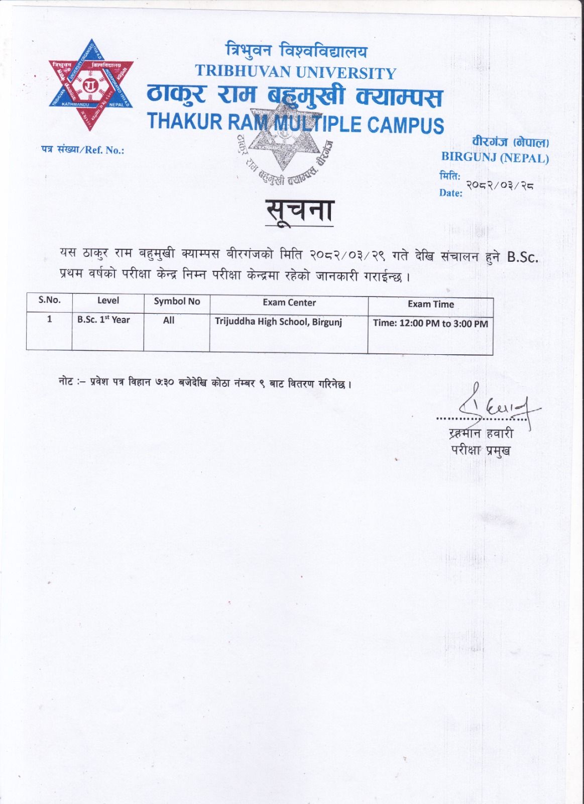 B.Sc. प्रथम वर्षको परीक्षा केन्द्र सम्बन्धी सूचना