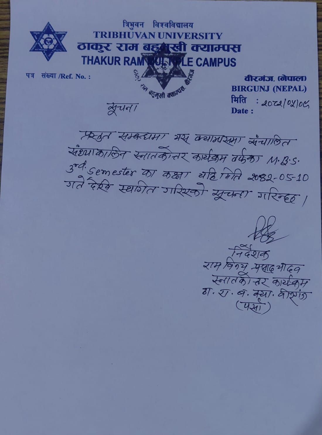 M.B.S. तेश्रो Semester को कक्षाहरु स्थगित गरिएको बारे सूचना