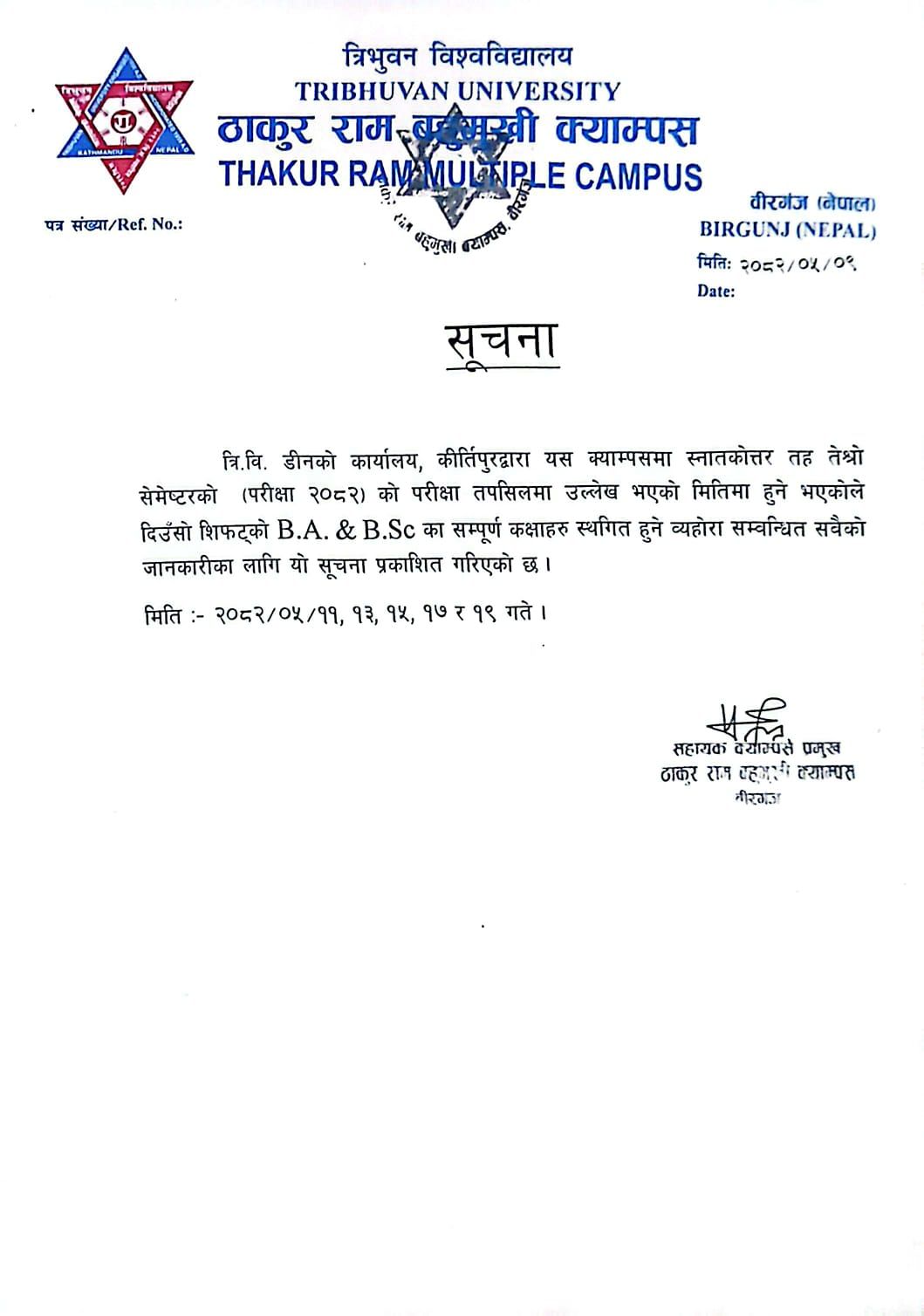 परीक्षाको कारण B.A. र B.Sc. को कक्षाहरु स्थगित बारे सूचना