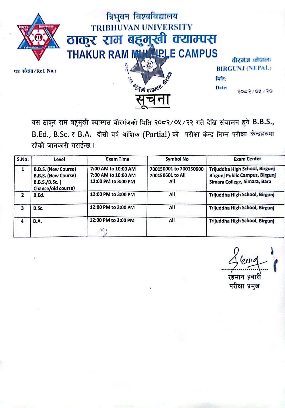 स्नातक तह दोश्रो वर्ष आंशिक तथा मौका परीक्षाको परीक्षा केन्द्र सम्बन्धि जरुरी सूचना