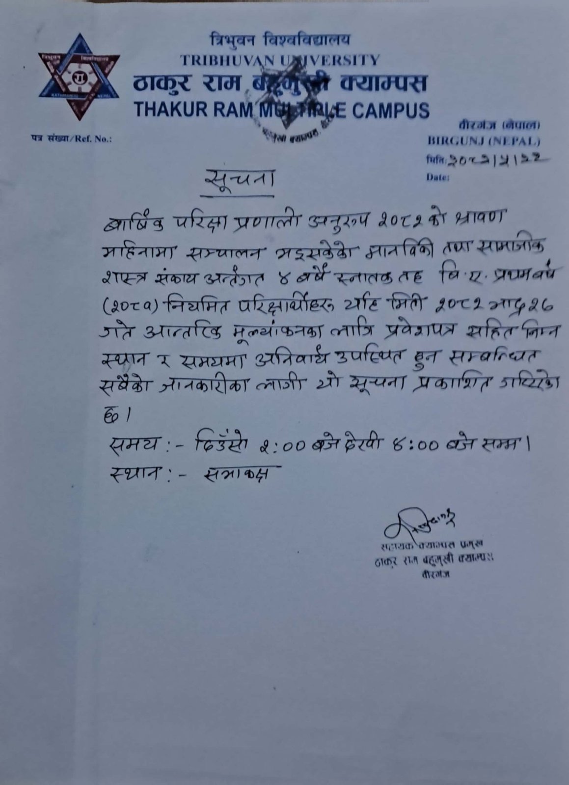 B.A. प्रथम वर्षको आन्तरीक मुल्यांकन परीक्षा सम्बन्धि सूचना