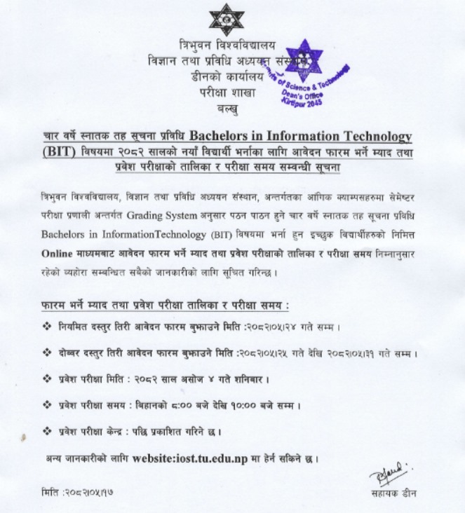 BIT (Bachelor In Information Technology) प्रवेश परीक्षाको फारम भर्ने समय भाद्र २४ गते सम्म, दोबर दस्तरमा २५ गते देखि ३१ गते सम्म, प्रवेश परीक्षा असोज ४ गते
