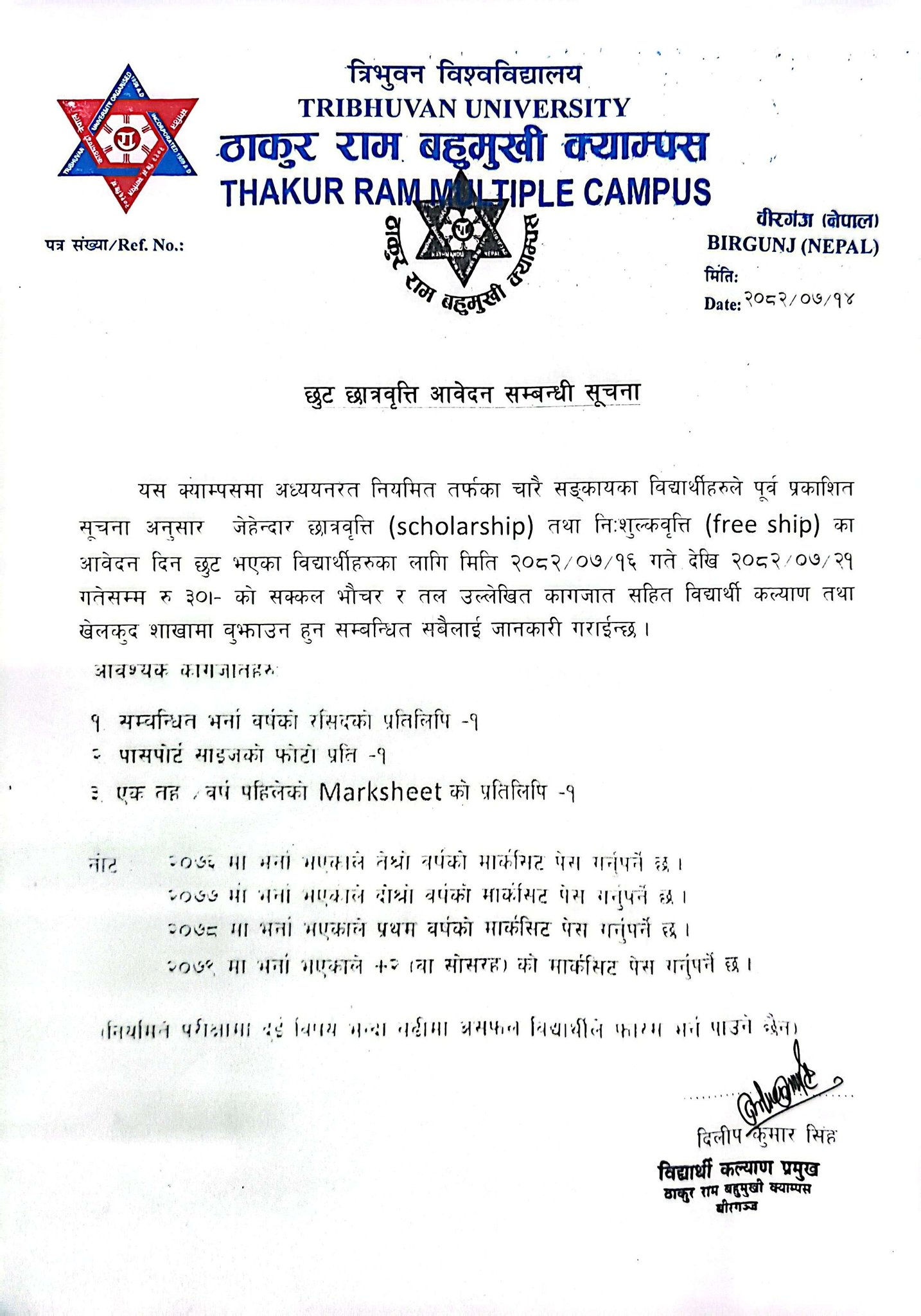 छुट छात्रवृत्ति आवेदन सम्बन्धी सूचना