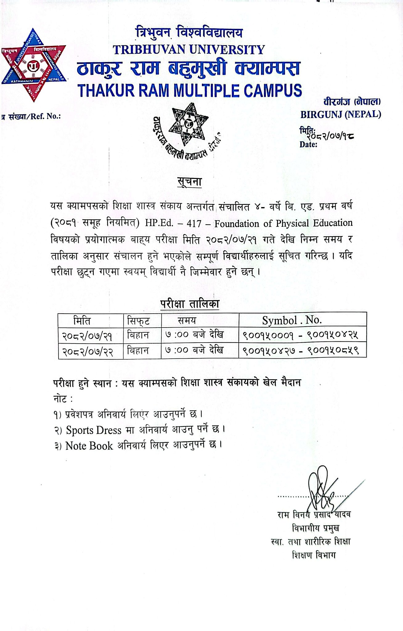 Notice Regarding Practical Exam of B.Ed. 1st year -2081 Batch HP.Ed.-417: Foundation of physical Education