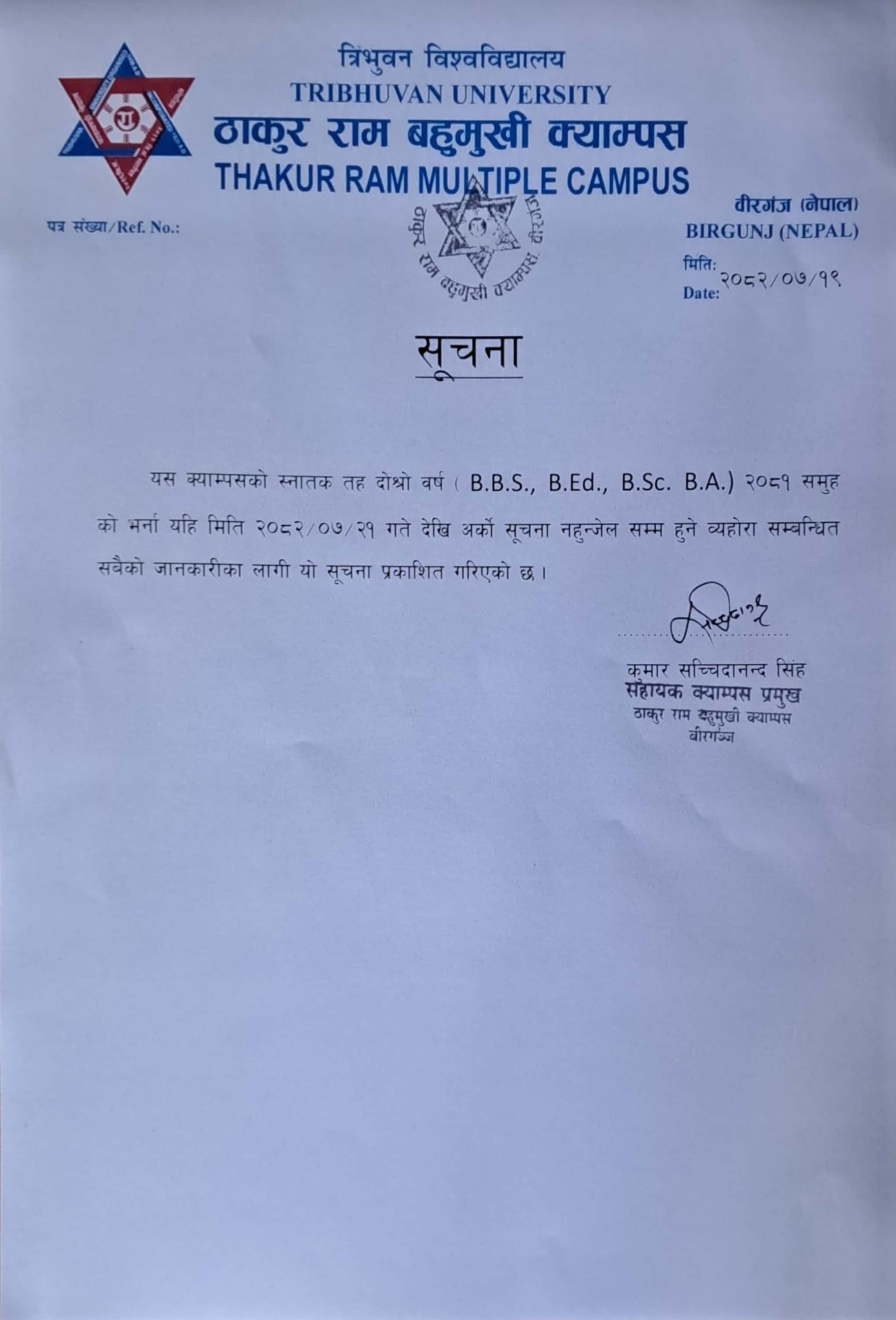 स्नातक तह ( B.B.S., B.Ed., B.Sc. र B.A) दोश्रो वर्ष २०८१ समुहको भर्ना सम्बन्धी जरुरी सूचना ।